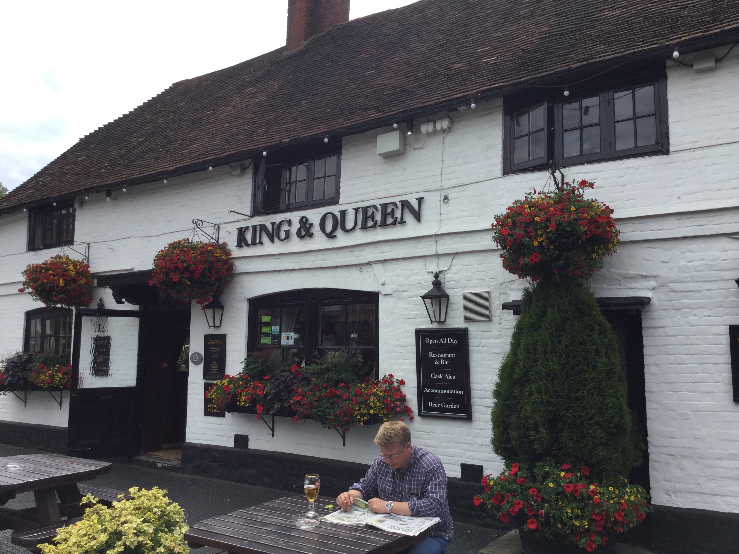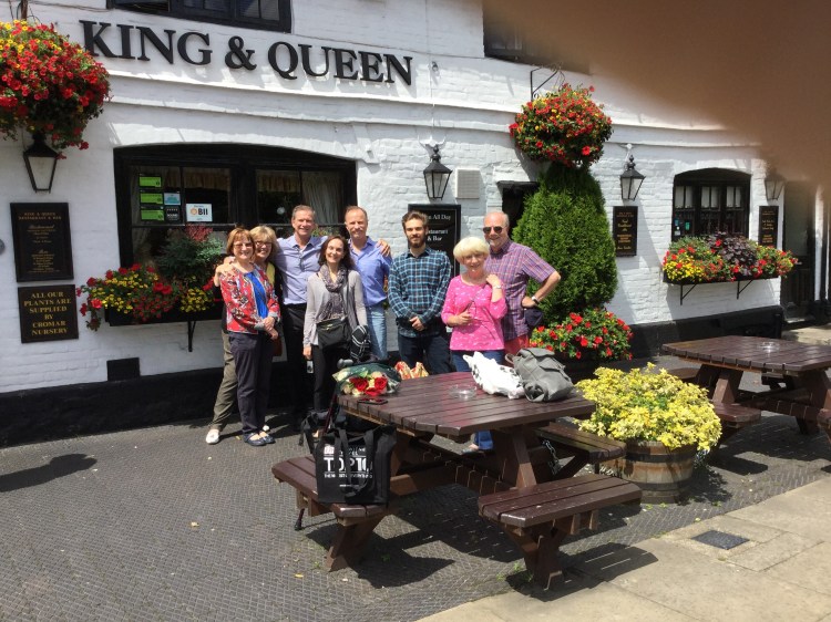 After coffee and croissant at the local cafe on Belgrave, Cher and I met Maggie, who had trained down from Birhingham, Helen from Liverpool, and Vic, MK and Alex from California at Victoria Station to train to East Malling and meet another cousin for brunch, Peter and his wife Margaret. (See picture in front of the King and Queen pub).
