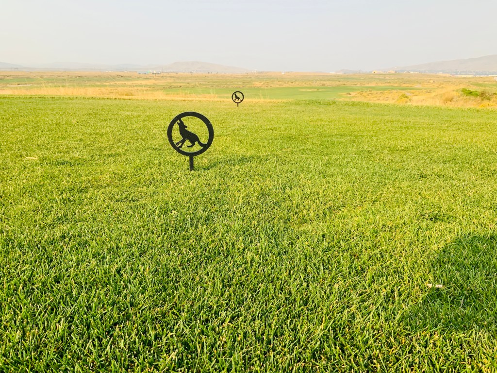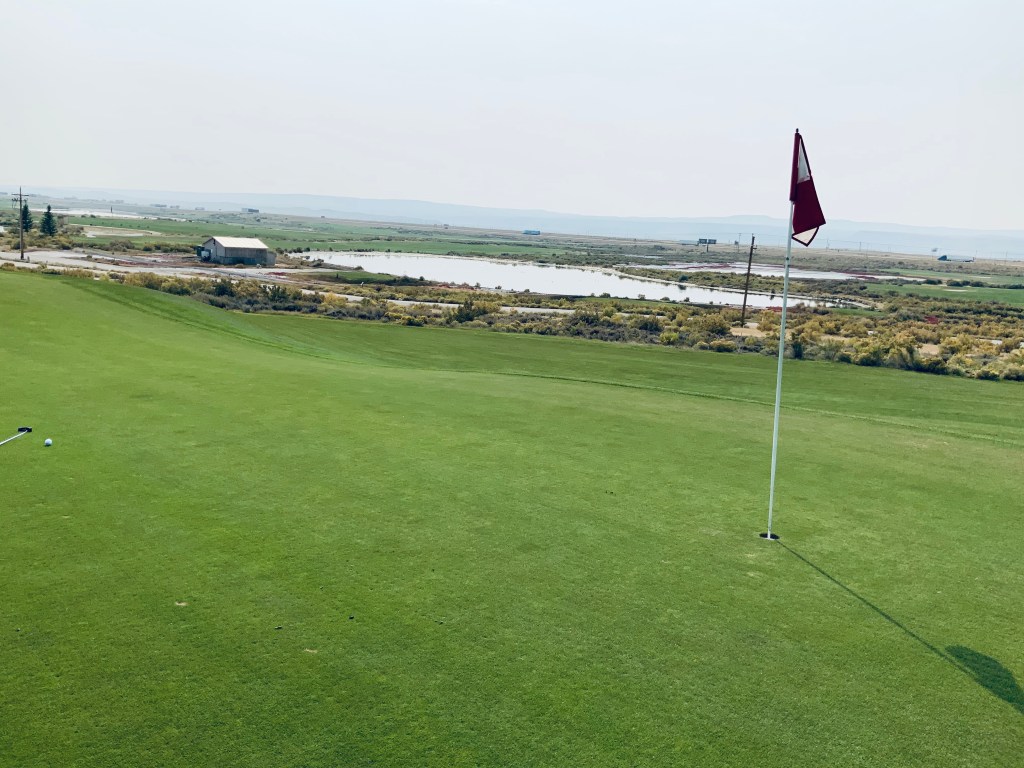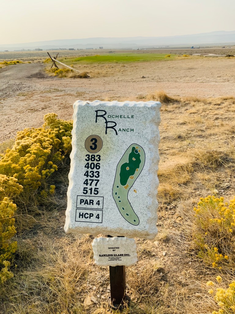 Rochelle Ranch course was 5 minutes from our hotel. Another great course! Literally a green oasis with pristine greens and incredible fairways. All in the middle of the brown craggy 6 to 7,000 foot elevation dust owl desert like plateau of Wyoming. This was in fact the only green we witnessed in Wyoming. Finished in 3 hours. Very few golfers on the course, but the quaint little town of Rawlings has 9,000 inhabitants, and the entire state only has 578,000 people.
