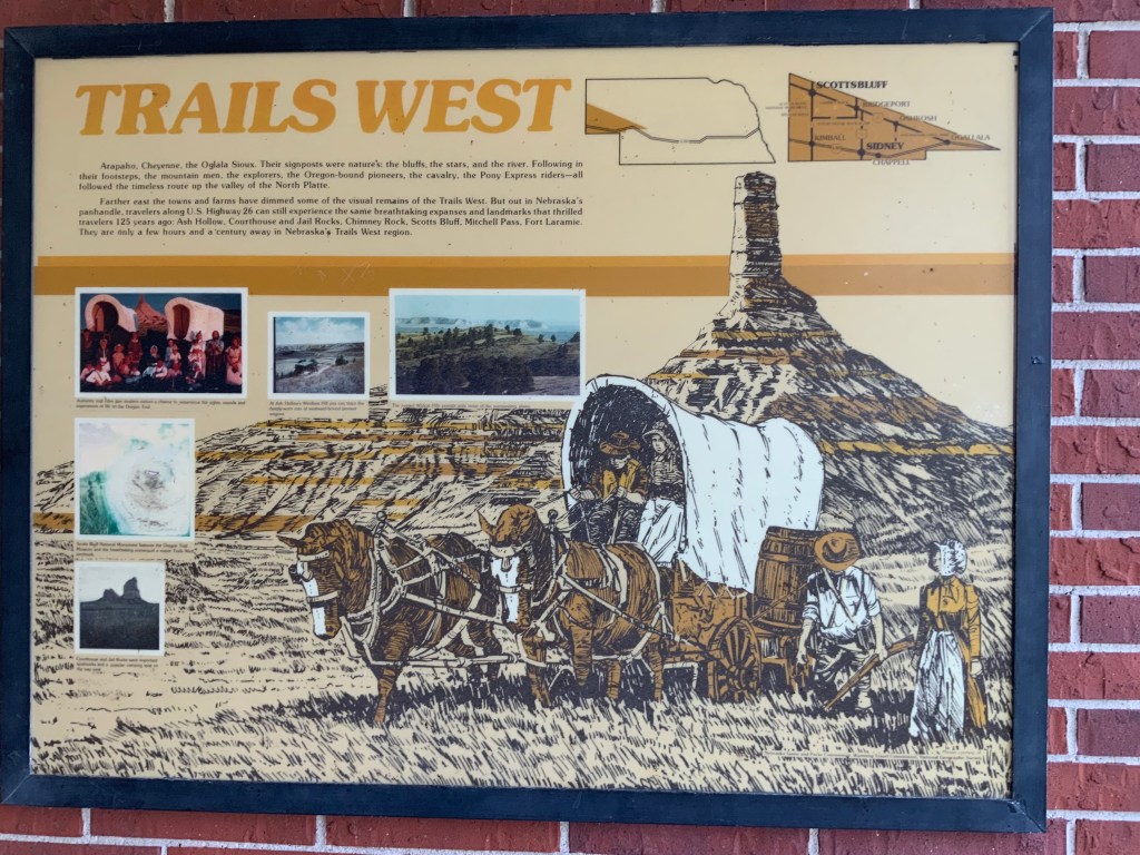 Golf involved wind blowing 20 to 30 mph the whole round. Cliff and Steve said yes predictably 20 or more daily. I almost blew over on one Teed shot. And our 500 mile drive was corn, corn, corn more corn with an occasional silo, and flat,flat,flat and extremely boringly straight. Oh, before I forget highway 80 follows the Platte River for miles and miles. And no wonder that the 4 big Trails heading west follow the Platte too: the Californian, the Mormon, the Oregon, and the Bozeman trails run on different sides of the river.