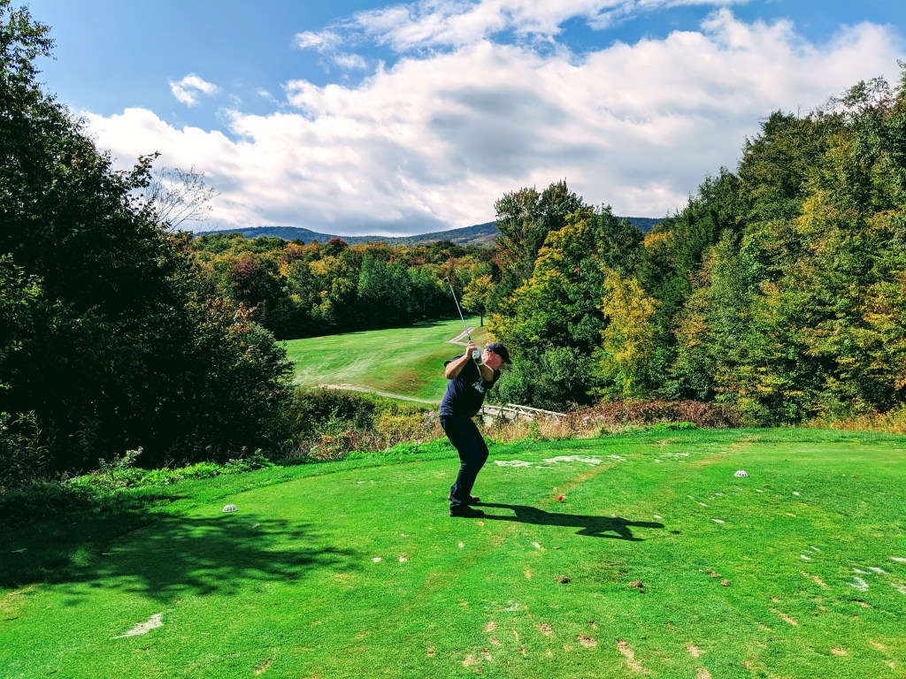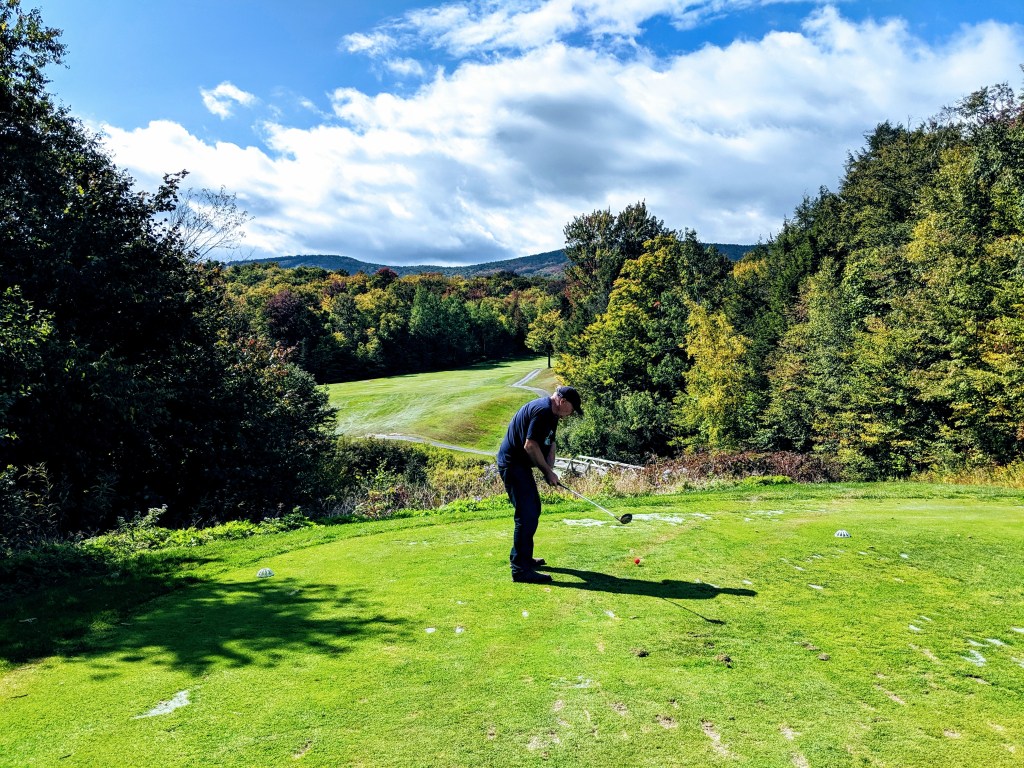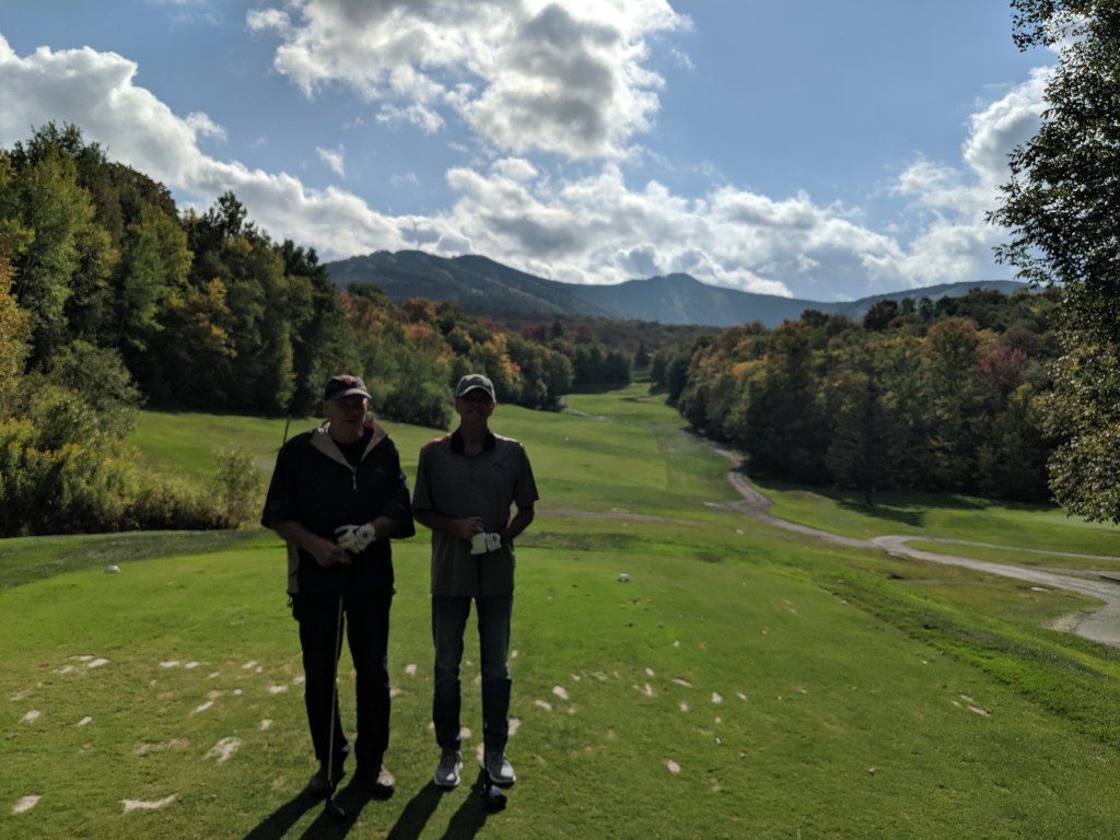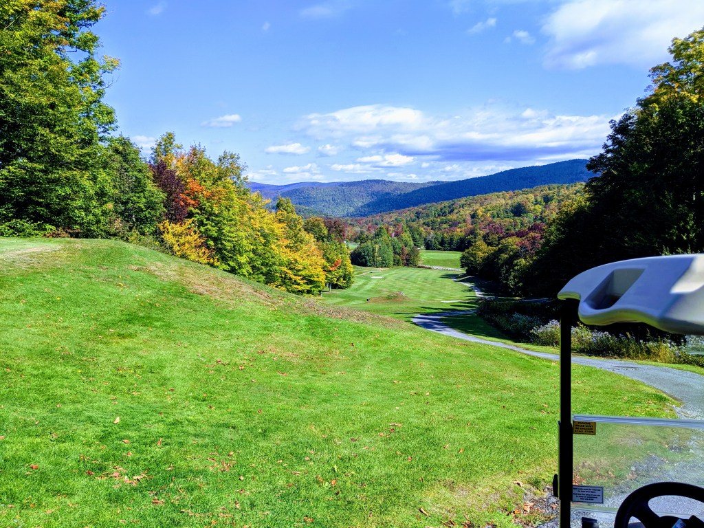 The Killington Mountain course was gorgeous and equally difficult. The greens had angles and undulations I’ve never seen before. To roll off a green was common place and to stop a putt nearly impossible. We joined two 30 year old local guys, Eamon and Trent. Both good guys and comparable golfers to us. We had fun. The leaves in the trees are beginning to change colors. As barren as were Wyoming, Nebraska, and Iowa, UpState NY, Vermont and the corner of Massachusetts, and Connecticut are treed up to the max. Full forests everywhere. Tomorrow we head to Washington, DC for the final round of golf, meet Kev’s brother, Paul and arrange train travel back to California. I must say I’m tired of driving. Here are some pics of Killington Mountain course and our drive from Vermont, thru Massachusetts to Connecticut.