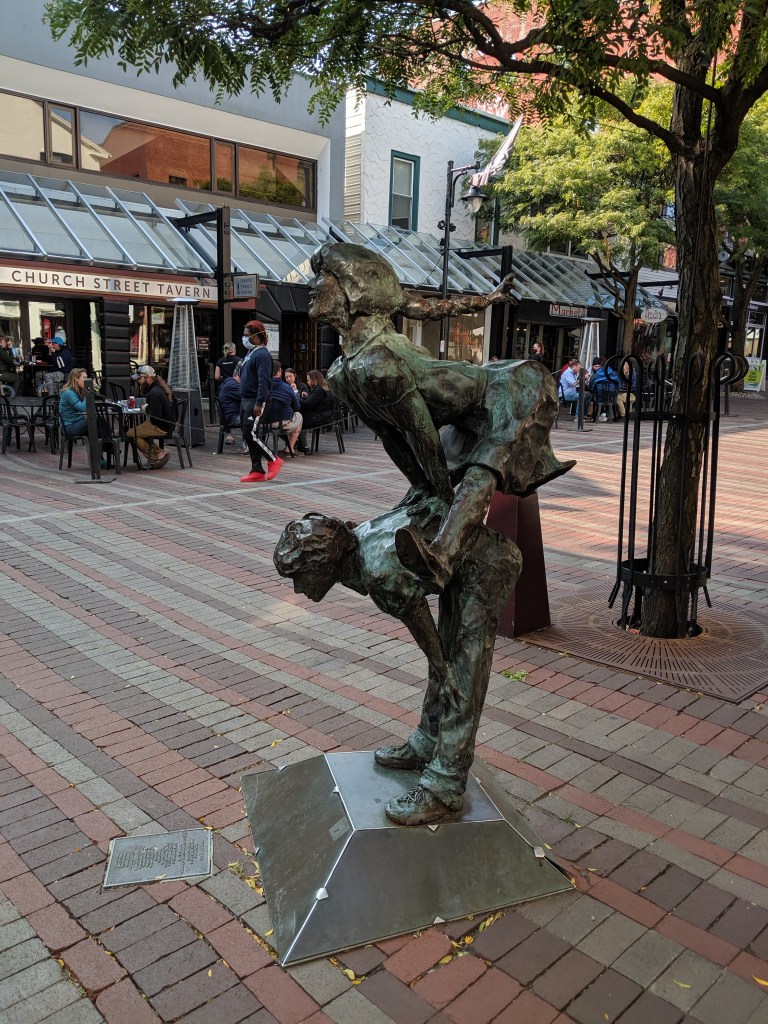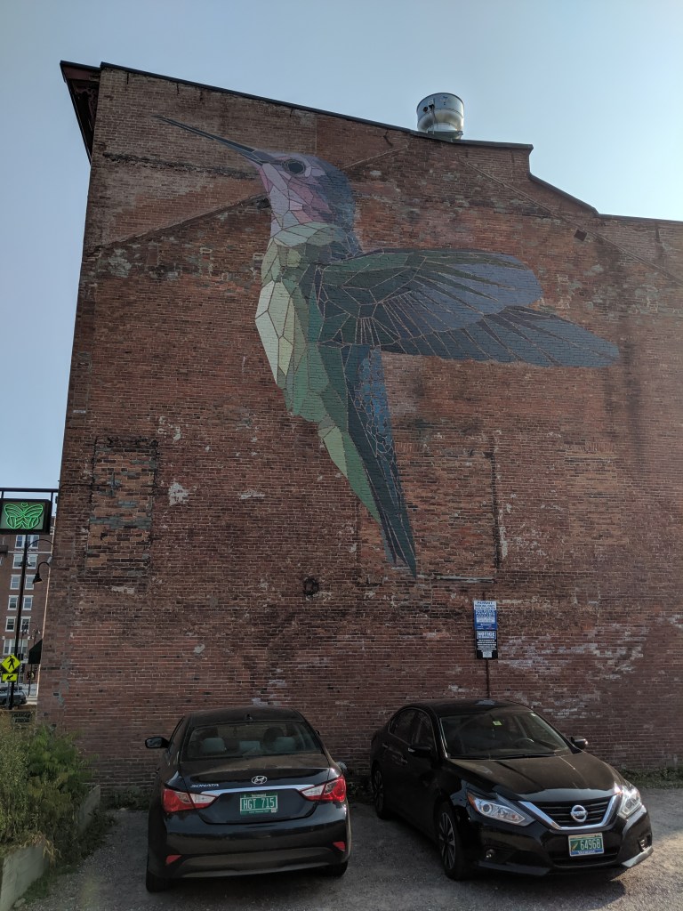 The quaint little town encompasses the University and you see students everywhere in the coffee houses, reading and writing. The campus is “mostly open” and many classes are held in normal fashion while others remotely. I mentioned yesterday that Vermont takes the pandemic Extremely Seriously and we got bumped from one hotel for not isolating for 14 days prior.