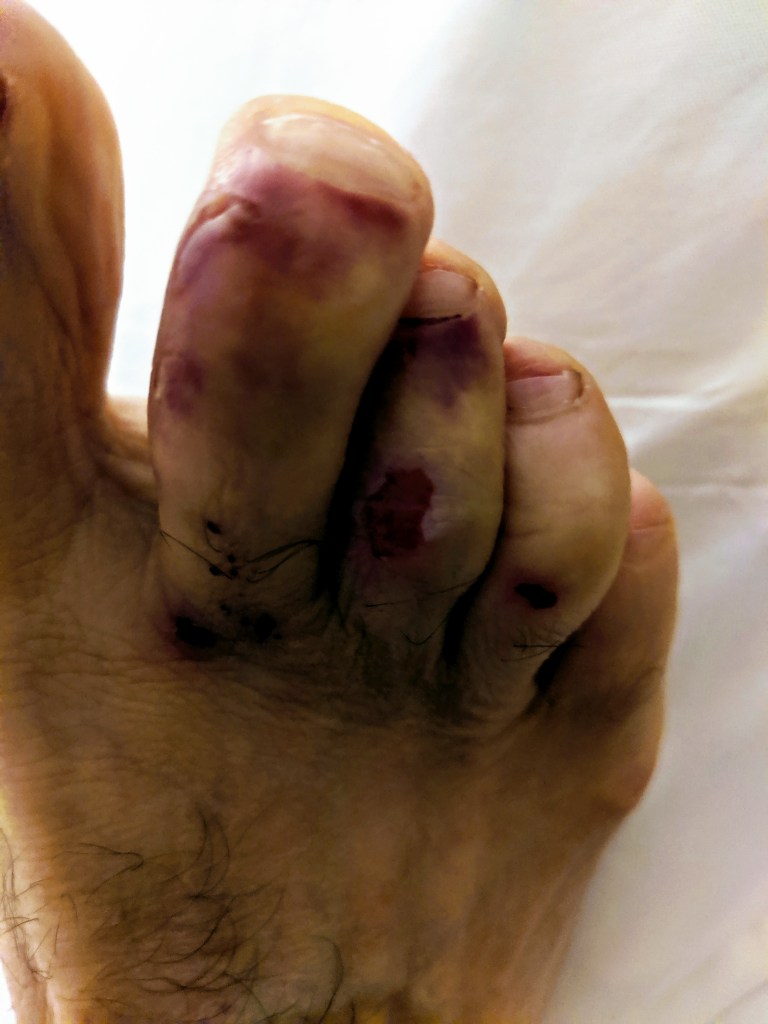 And so it happened has evening. I fell into a deep sleep and somehow became the Captain and jumped straight up on my hotel bed to avoid a sword being swung at me, so I jumped off the bed to illude my nocturnal villain, and in the process landed hard with my left foot flat on the floor and my right foot smacked awkwardly against the wooden suitcase bench at the foot of the bed cutting up two toes and possibly breaking the toe next to my big toe. That wasn’t enough… In the total blackness of the room I sought the hotel door and then coming out of my nightmarish stupor I couldn’t find the bathroom door, or light switch anywhere. Kevin woke up to direct me to the bathroom door.