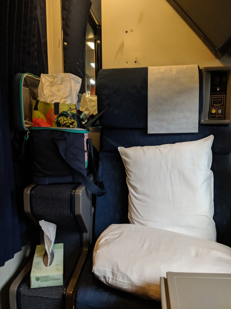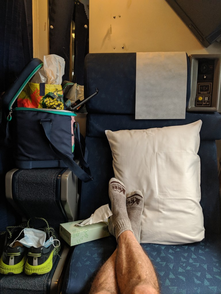 Just as I write this Kev, who has a sleeper upstairs, came down to my room like the ill-fated hazmat team and sprayed disinfectant all over my 5′ x 6′ sleeper room. That has been one of the funniest aspects of travelling with K. We enter a hotel room and he sprays volumes of disinfectant everywhere. When I try to pick up the hotel phone or the tv remote, it’s like a slippery bar of wet soap. Puddles of disinfectant remain even the next day when we check out.