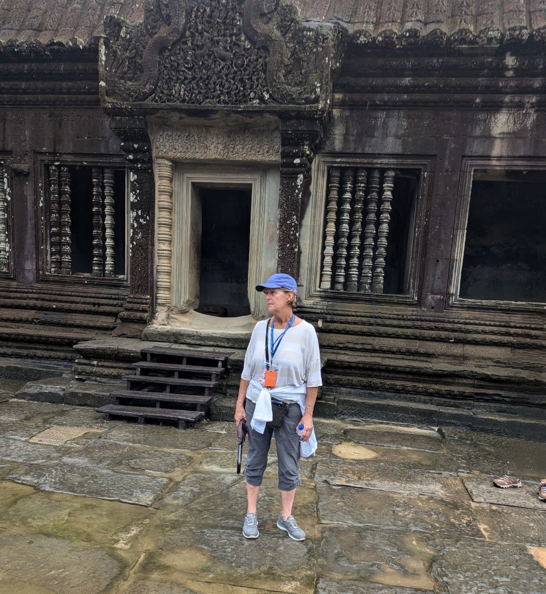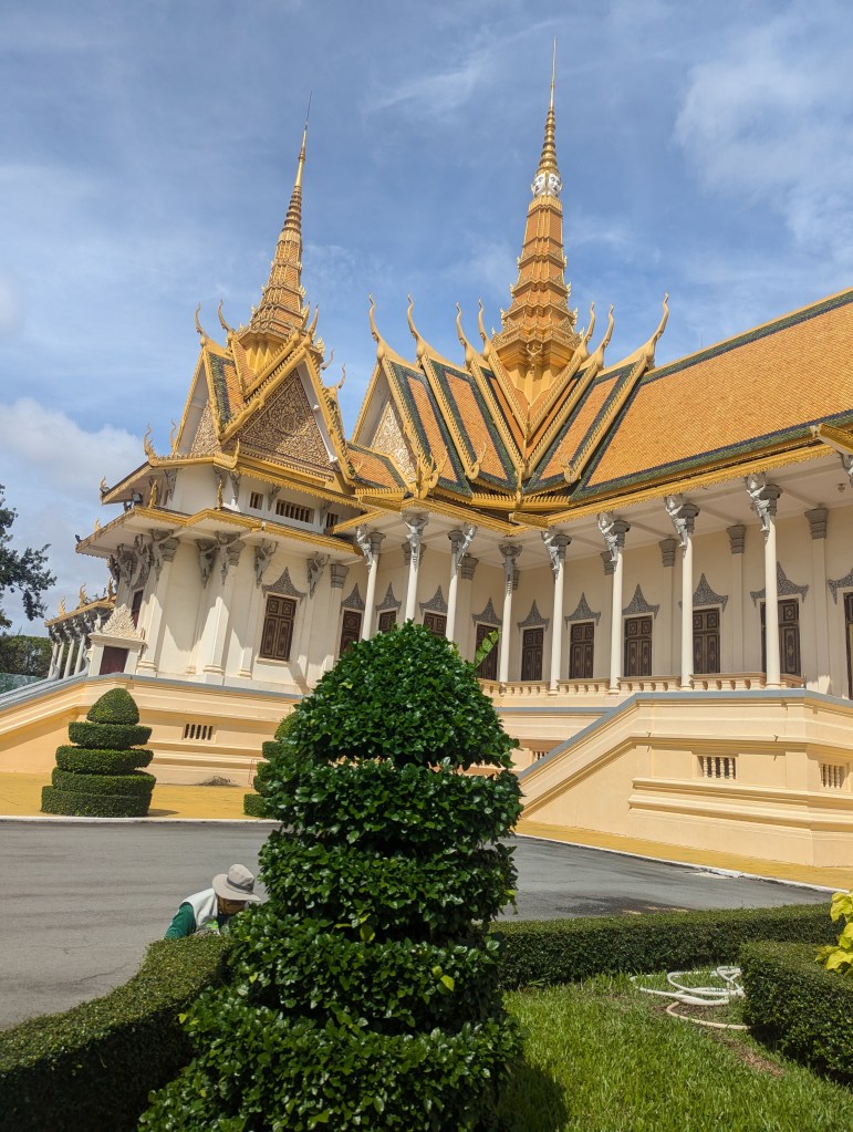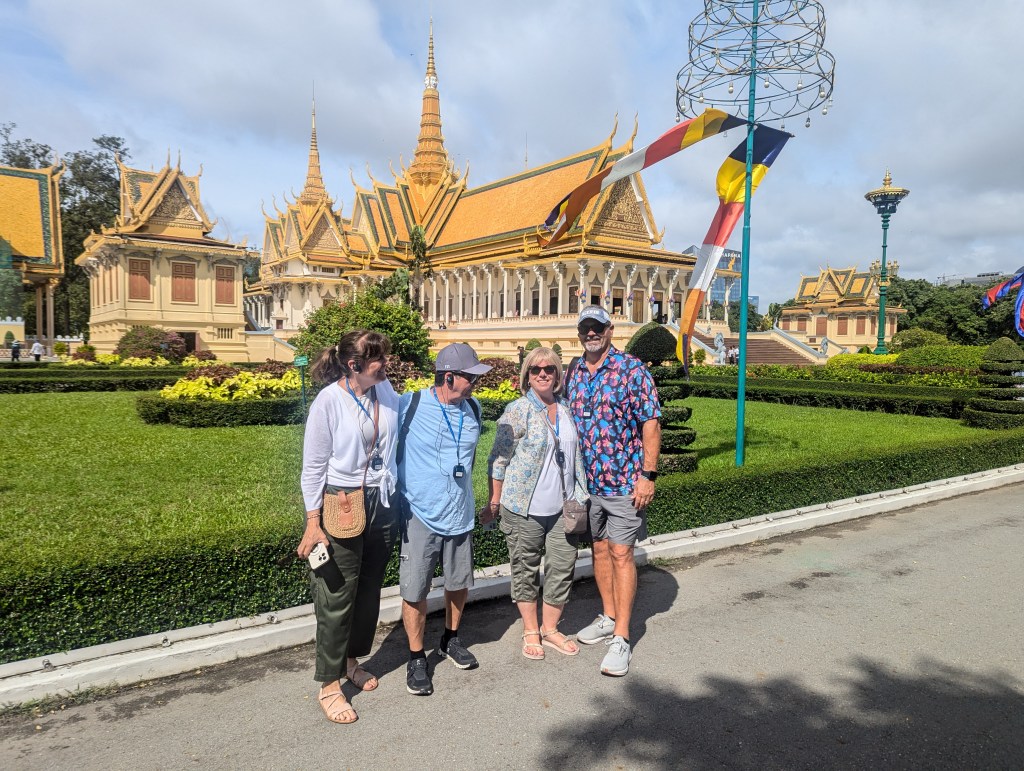We cruise into Cambodia and the capital, Phnom Penh. This is the third day in a row i’ve done yoga on the sundeck at 6:30 a.m. The tiny , 4′ 10ish, 85 lbsish Vietnamese wellness coordinator, Vy is attempting to lossen me and a handful of other clients before we hit the streets touring. She’s incredible! After coffee we visited the Royal Palace, and the spectacular Silver Pagoda, and many other gold statues. During the civil war from 1975 to 1979 many golden statues were taken by the Khmer Rouge. Following that we visited the National Museum and the many Buddha and Hindu statues. Some date back to 12th and 13th centuries. Like the gold snd silver statues in the Palace, many of their historic religious artifacts were stolen and or broken by the Khmer Rouge. They have a massive governmental project of piecing some of these historic statues back together. After the war art historians have found pieces all over Cambodia and other south east asian countries and some have been returned