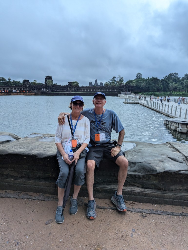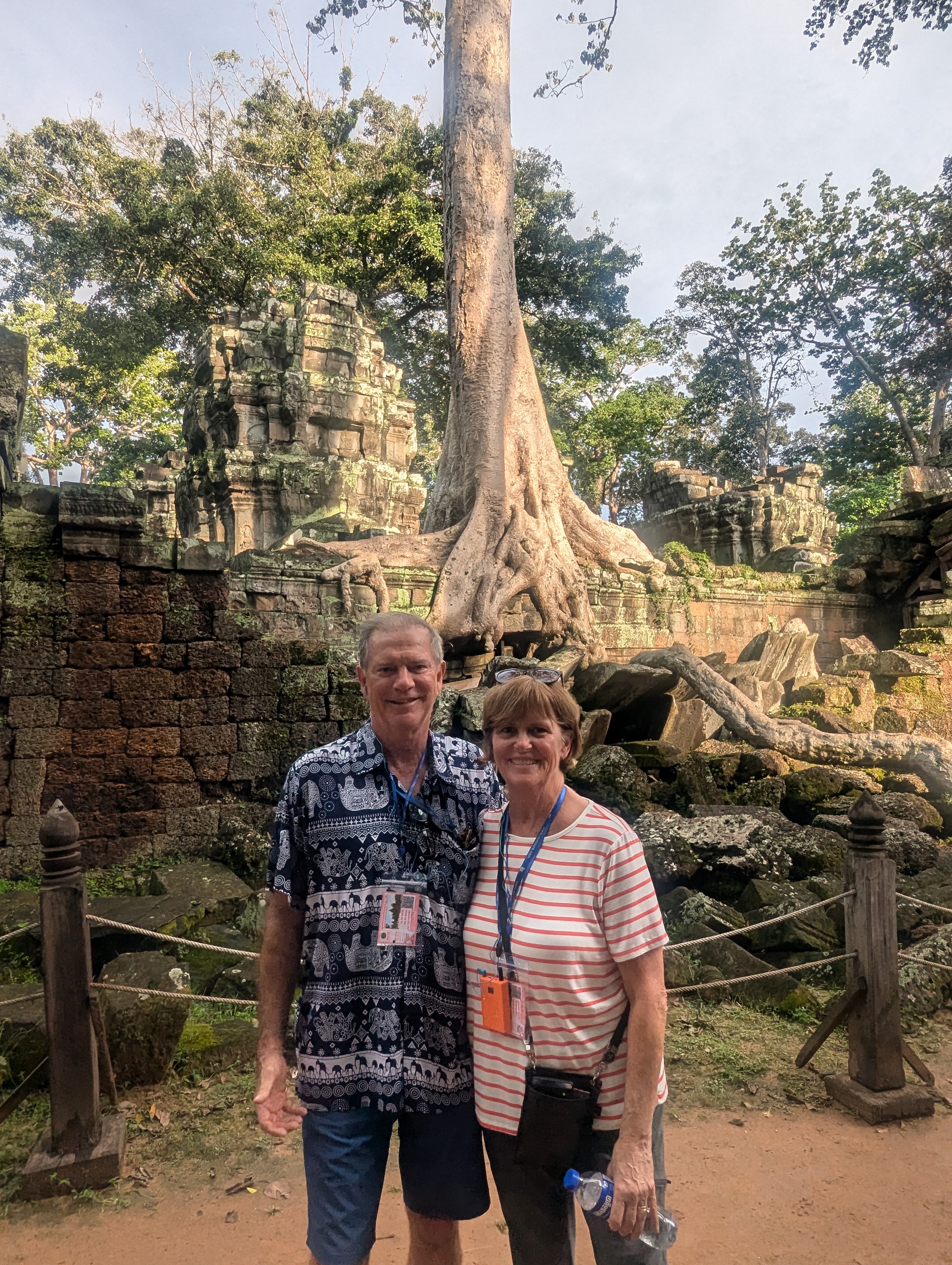 My favorite temple tour, Ta Prohm Temple, featured in Indiana Jones and the Tomb Raiders. 12th century spralling grounds with over grown foliage in among the massive rock structures, and giant trees with roots sprouting in, through and hugging the rock roofs and walls. Known locally as “Kingdom of the Trees”. In th late 13th century and early 13th a million people live in this sacred area along with over a thousand monks. Tomorrow we visit Angkor Wat, the largest religious monument in the world, built by King Suryavarman II also in the 12th century, but this was to honor the Hindu god Vishnu.