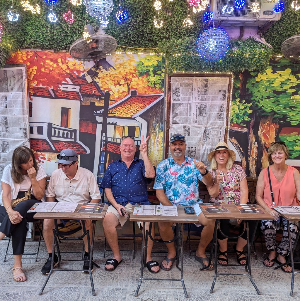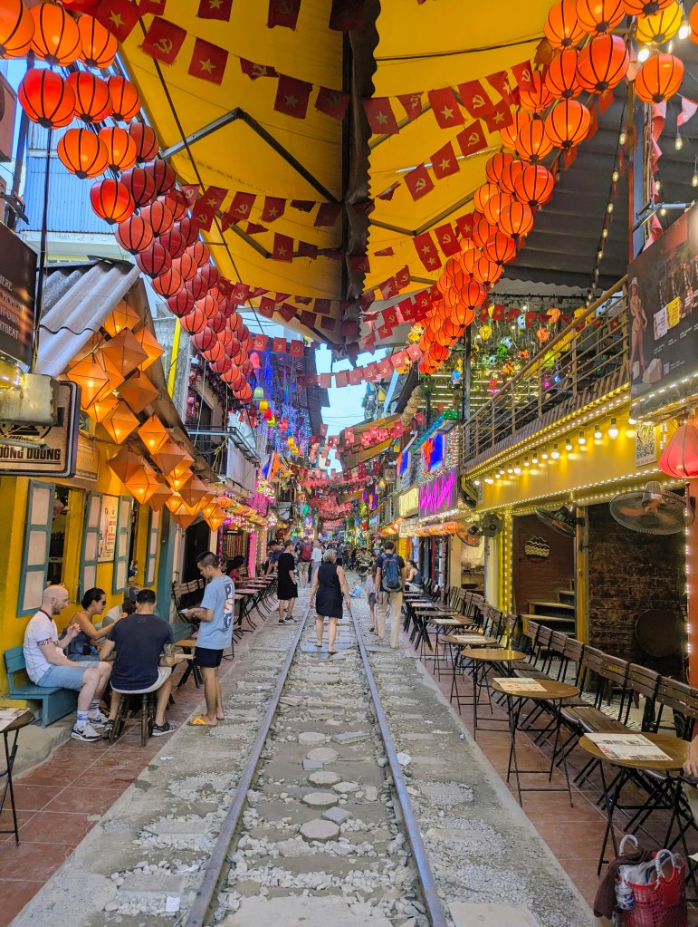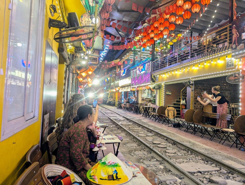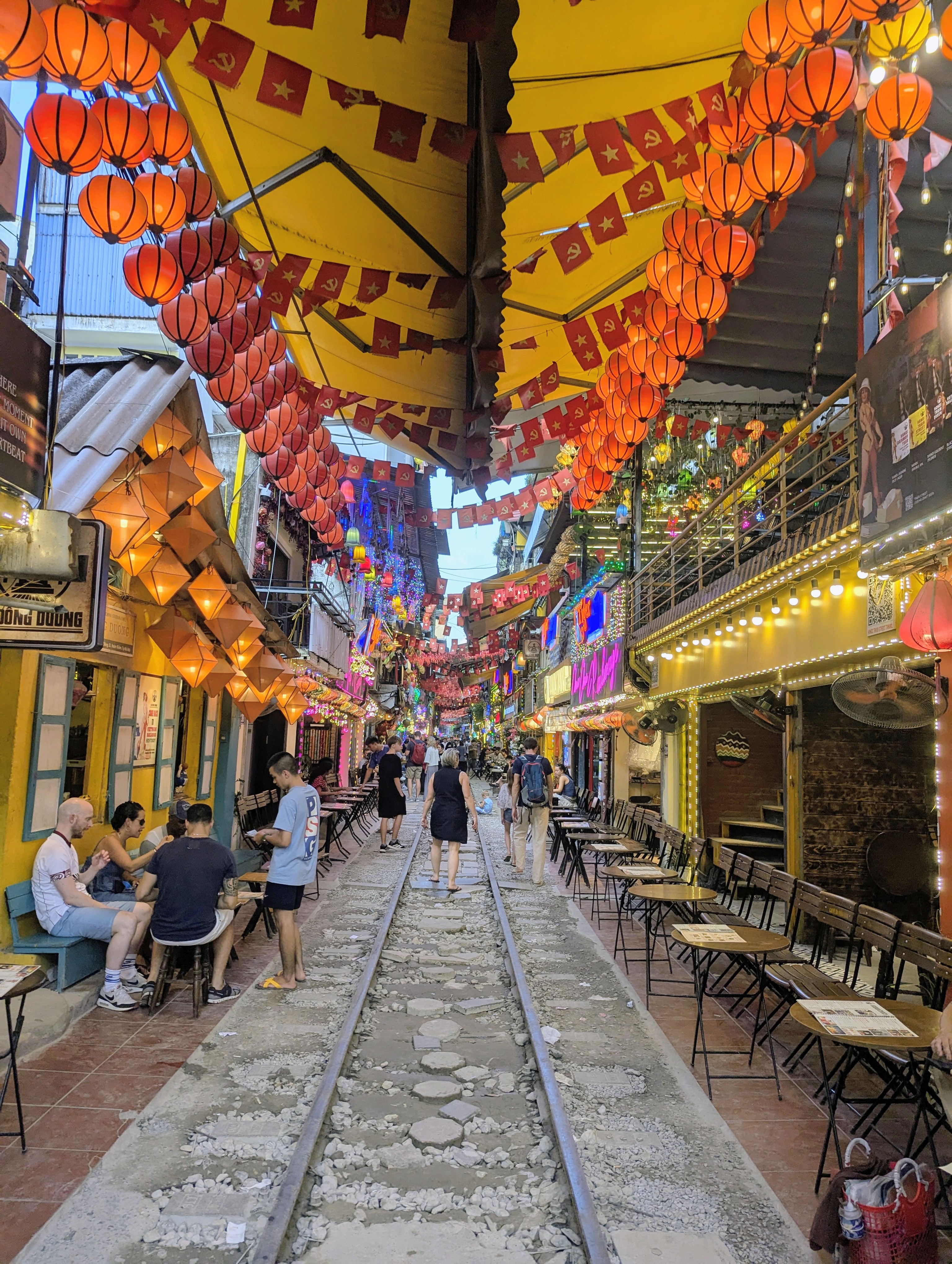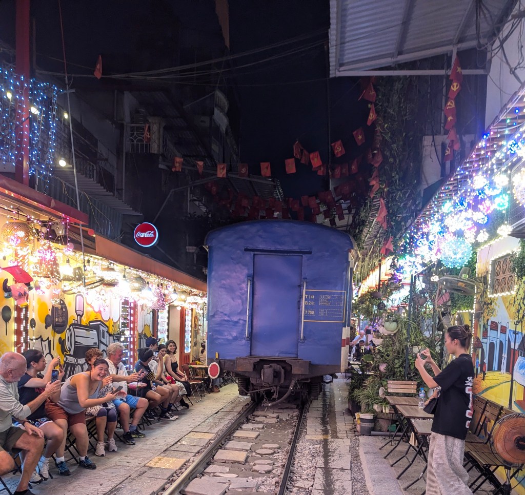I really wish my pics uploaded! Six of us adventured to the commonly known “Train Street”, where three times a day a train rolls way too close to the tables, and bars and restaurants on either side of this colorful two block section of Hanoi. We drank beers and hurriedly moved our tables as the train rumbled too near for comfort.